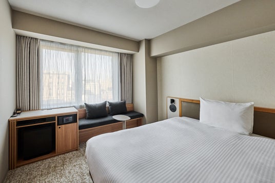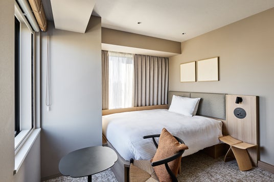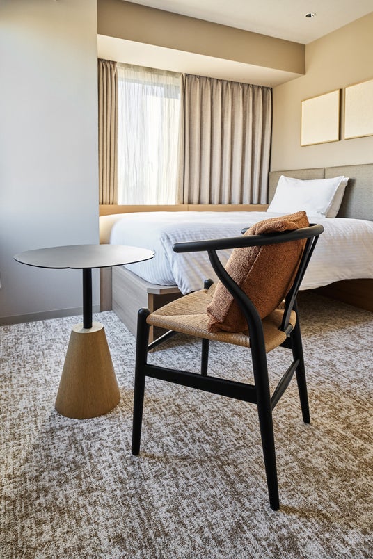 角部屋で、2面採光のダブルルーム。ベッド下を収納スペースとして活用し、室内をすっきりと広く使えるレイアウトにしました。窓際には北欧家具を象徴するブランド「カール・ハンセン&サン」の「CH24(Y チェア)」を、ベッドサイドには国内外で愛される柳宗理デザインの名作「バタフライスツール」をコーディネート。名作家具に触れながら、ゆったりとした時間をお過ごしいただけます。