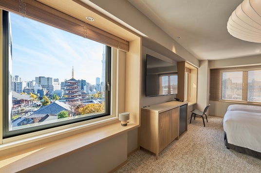 また、ベッドのヘッドボードには、日本古来のデザインである格子と障子をイメージし、優しい間接照明がリラックスできる空間を作り出します。テレビの下には茶器やお茶菓子をご用意し、工芸品に触れながらお茶を楽しむ体験をご提供いたします。7階以上の「プレシャスコンフォートツイン」は、浅草寺と五重塔、東京スカイツリー(R)を望む、浅草の借景を楽しめる特別な客室となっています。