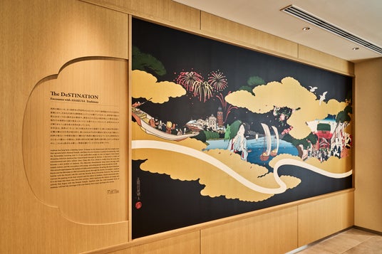OZ氏が「浅草の今と昔」をテーマに、本ホテルの向かいに位置する「リッチモンドホテルプレミア浅草」に滞在しながら、街の雰囲気を感じ取りつつ制作した作品。紹介文の周りにあるレリーフは、日本刀の鍔(つば)をモチーフにしています。