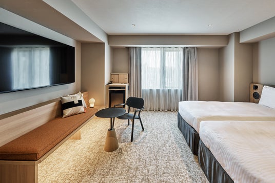 ダブルルーム2室を連結し、ソファでくつろげるゆとりある広さを備えたツインルームを新設しました。北欧のミニマルさと日本の静謐さを融合させて、空間を構成しています。
