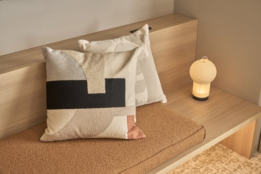 北欧デザインのクッションカバーと、提灯のようなポータブル照明