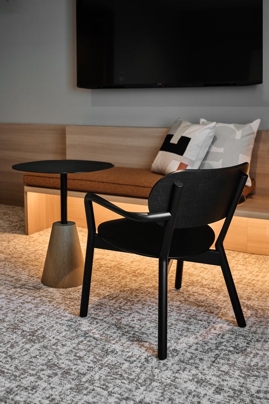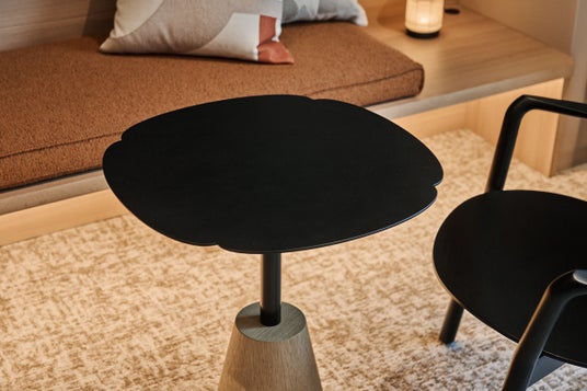 釘隠しの花形をモチーフとしたサイドテーブルに、アクセントカラーであるスミ色のラウンジチェアをコーディネート。ベッドのヘッドボード周りはシンメトリーデザインを用い、空間に折り目正しい雰囲気を与えています。カーテンは、高い遮光性と美しさを兼ね備えている、アクタ?のオリジナルです。