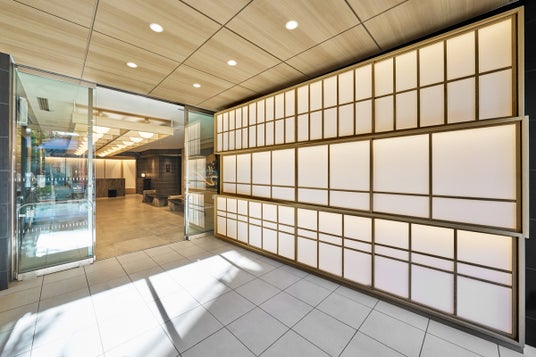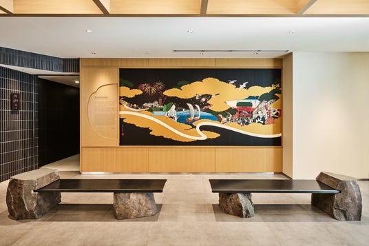 1階ロビーは、浅草の「今と昔」を重ね合わせた「OZ-尾頭-山口佳祐氏」の絵画を中心に構成。天井には浅草の灯り文化から着想した提灯格子を施し、柔らかい光でお客様をお迎えします。絵画前のベンチには、浅草の歴史的な建築にも用いられてきた神奈川県真鶴町産の小松石と、座面には黒皮風に仕上げた鋼材を採用。床はモルタル風タイルで仕上げました。木材と和紙、石と鉄といった異素材の対比によって、ほどよい陰影とエッジを加えています。