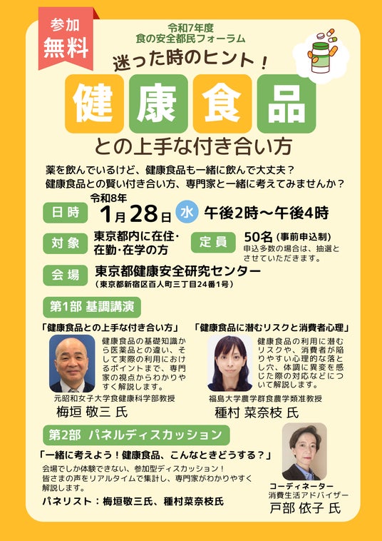 東京都は、都民、事業者及び行政が食の安全に関する情報を共有し、考える場として、毎年「食の安全都民フォーラム」を開催しています。今回は、「健康食品」をテーマに取り上げます。
