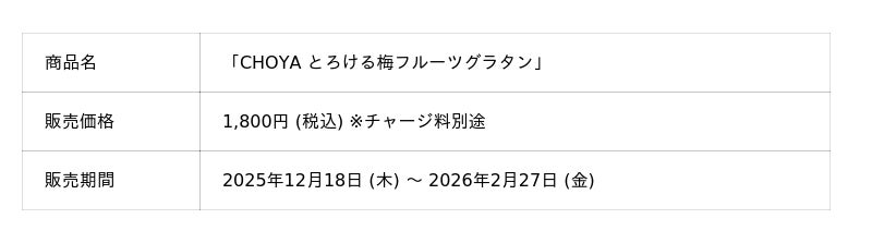 チョーヤ梅酒株式会社 (本社:大阪府羽曳野市、社長:金銅重弘、以下チョーヤ) は、梅酒カクテル専門店「The CHOYA 銀座BAR (ザ チョーヤ ギンザバー) 」にて、厳選した梅素材にクレームブリュレとフルーツグラタンを融合させ、南高梅を使用した3種類のオリジナルシロップと楽しむ、新感覚スイーツ「CHOYA とろける梅フルーツグラタン」を2025年12月18日 (木) から2026年2月27日 (金) まで期間限定で販売します。寒さ厳しい冬の季節に、オーブンで焼き上げたフルーツのやさしい酸味と、濃厚なカスタードクリームのとろける甘み。心まで温める贅沢なひとときをお届けします。