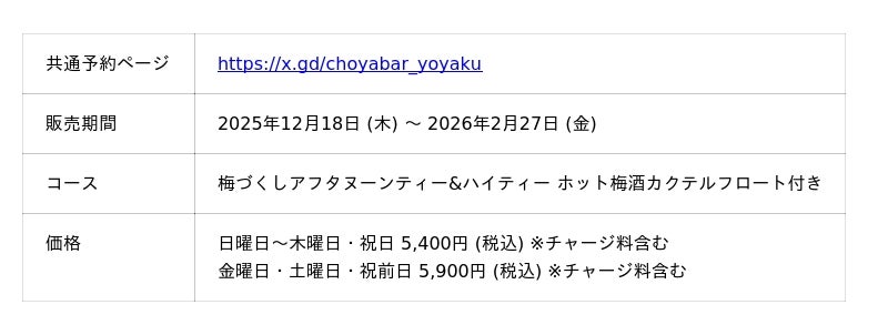 新作梅スイーツ「CHOYA とろける梅フルーツグラタン」は、アルコール入りの酔うタイプとノンアルコールの酔わないタイプからお選びいただけます。また、梅をアレンジしたフードや梅酒との相性を考えたオードブルやスイーツに、3~5種類の利き梅酒が楽しめるフライトセットや人気の梅酒カクテルにノンアルコール梅酒カクテルなど、100種類以上のドリンクが2時間30分飲み放題 (ラストオーダー30分前)の「梅づくしアフタヌーンティー&ハイティー」コースの選べるデザートとしてもお楽しみいただけます。コーヒーや紅茶などホットドリンクも飲み放題に含まれておりますので、大人カジュアルな空間でゆったりくつろぎながらお楽しみください。お友達やご家族との遅めのランチやくつろぎのカフェタイムとして、お買い物の休憩の場としてお気軽にお立ち寄りください。