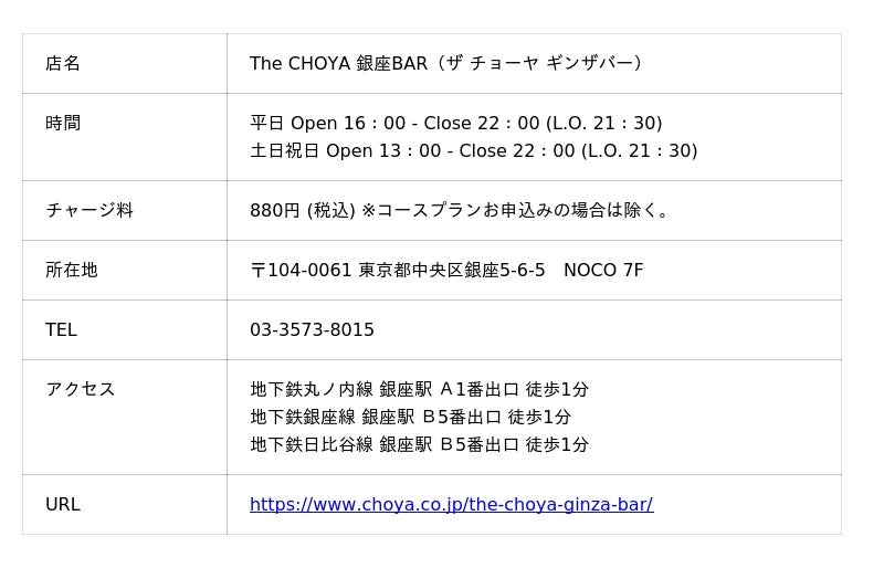 The CHOYA 銀座BARでは、お客様に「常に梅との新しい出会い」をお届けする事をコンセプトにこれからも運営して参ります。梅気分の際には、お気軽にお立ち寄りください。