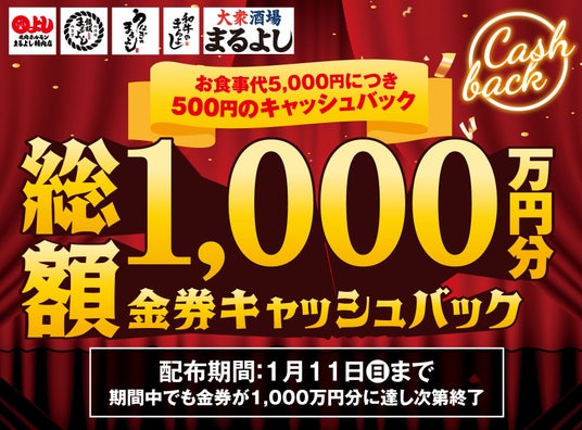 まるよしグループ全16店舗(https://maruyoshi-seiniku.com)にて、総額1,000万円分の金券キャッシュバックキャンペーンを実施いたします。