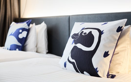 客室内には、学生たちが制作した多彩なアート作品を配置しました。神戸須磨シーワールドで展示している生きものをデザインしたシャンプーボトルや窓ステッカー、クッションに加え、海中を泳ぐシャチを再現した海中ジオラマ、ギヤマンクラゲやチンアナゴをデザインしたネオンなど、多彩なアイテムで夜の海の世界を表現いたしました。また、コースターやシャチをかたどった歯ブラシ立てなどお持ち帰りアイテムも充実しております。