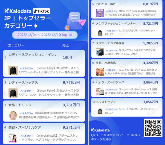 『Kalodata』は中国の高帆破浪科技(浙江)有限責任公司が提供するTikTok Shop分析ツールで、当社は今年8月より日本国内での正規代理店として提供を開始しました。本レポートでは、バズった動画や商品カテゴリの動向など幅広く紹介し、最新の消費トレンドをお伝えします。