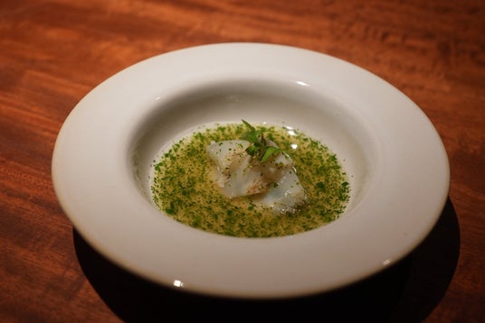 今回のコラボレーションは、ヘソス氏が「日本の食材は世界でも最高峰のひとつ」と評価し、素材力への信頼を軸にコースを構築するところからスタートしました。親日家としても知られるヘソス氏は、日本の食材をふんだんに使用し、今回のプレゼンテーションは全て和包丁を使って調理を行いました。また、懐石料理のフォーマットを参考にし「スープ・焼き物・野菜料理・生の料理(刺身的存在)」の流れを意識してコースをデザイン。ヘソス氏が日本に興味をもったきっかけは、23歳の時フランスで働いていた経験が原点となっています。師匠であるアレクサンドル・クイヨン氏は、かつて銀座「奥田」で修行経験があり、その数年間ともに仕事をした師匠が「日本の影響を非常に強く受けていた」ことから、思想と感性を通じて日本文化への興味が芽生えました。
