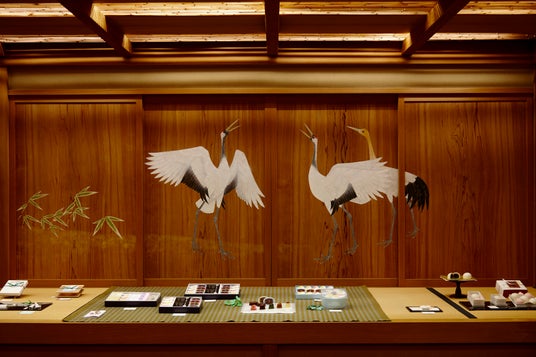 鶴屋吉信本店・1階奥の杉戸絵に描かれた「丹頂鶴」の絵をあしらったデザインです。こちらは1992年に現在の本店建物が竣工した際、これを記念して日本画家・上村淳之画伯に特別にご制作いただきました、本店を象徴する作品でございます。