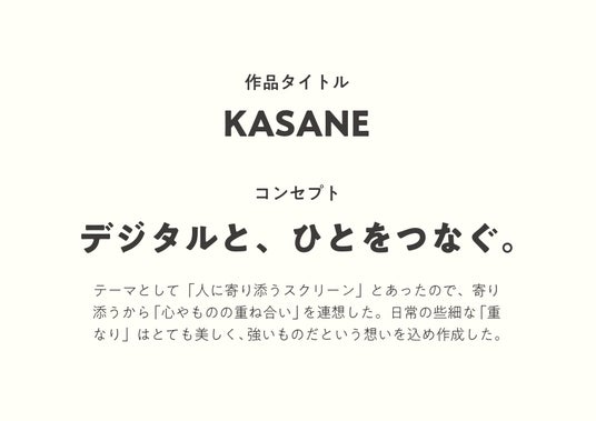 大賞をいただいてすごくびっくりしています。私の映像で少しでも見る方の心や気持ちが安らいでくれればいいなと思います。「デジタルと、人をつなぐ」というコンセプトで作りました。人に寄り添うスクリーンというテーマを、シャンパングラスの乾杯で人と人がつながる表現をしたり、動物など自分の好きなことで少しでも気持ちがあたたかくなることを思って制作しました。