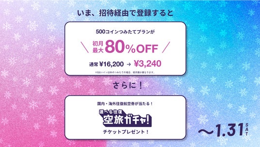 招待経由のご登録で、今なら500コインつみたてが初月3,240円(通常16,200円)さらに、国内または海外の往復航空券が当たる空旅ガチャチケットがもらえるお得なキャンペーンです。さらに300コイン以上のつみたてを継続すると、登録2ヶ月目から4ヶ月目まで毎月50コインがもらえます。