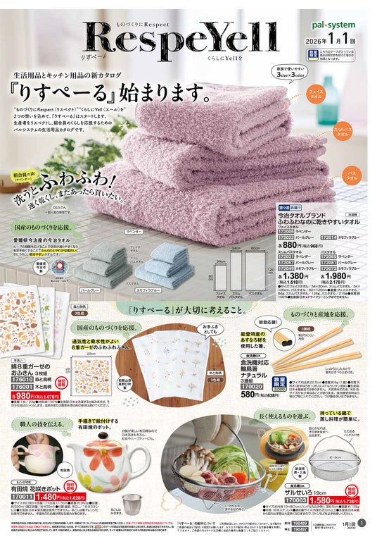 パルシステム連合会(本部:新宿区大久保、理事長:渋澤温之)は12月15日(月)から、既存の生活用品カタログ「パルくらす」とキッチン用品カタログ「キッチンぷらす」を統合した新媒体「RespeYell(りすぺーる)」の注文受付を開始します。毎週24ページの誌面で、ものづくりへの尊敬と利用者のくらし応援の思いを込めた生活用品を提案します。
