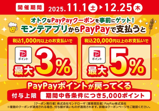 事前にPayPayアプリ上でPayPayクーポンを獲得のうえ、対象店舗(※3)をご利用のお会計時にモンテアプリのPayPay決済をご利用いただくと、決済金額の最大5%のPayPayポイントが後日付与されます。
