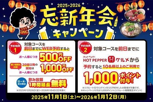 2025年11月1日から2026年1月12日までの期間、全国の対象店舗で「忘新年会キャンペーン」を実施中です。