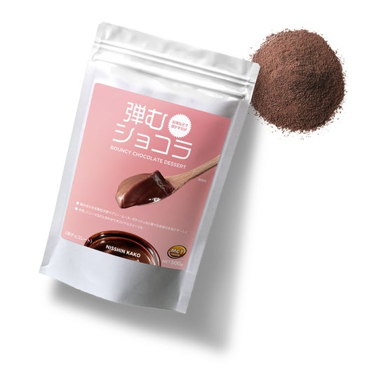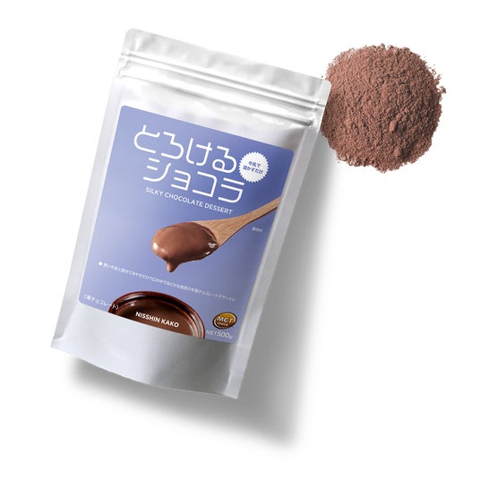 「弾むショコラ」「とろけるショコラ」とは?お湯や牛乳と混ぜて冷やすだけで本格的なチョコレートデザートが作れる粉末タイプのチョコレートです。粉の混合品ではなく“製品自体がチョコレート”であることが最大の特長で、独自の製造技術により滑らかな口当たりと心地よい食感を実現しました。製菓・製パン現場での作業効率化に貢献するとともに、介護食や高齢者向けデザートとしても活用できるユニバーサルな設計です。