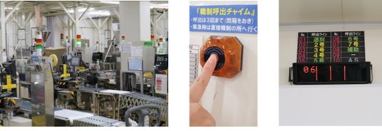聴覚障がいのある社員が生産設備の運転状況などを光や色で感知できるよう、シグナルタワーを導入しています。また、ラインの責任者に連絡する呼び出しボタンを設置することで、迅速な対応を可能にしています。