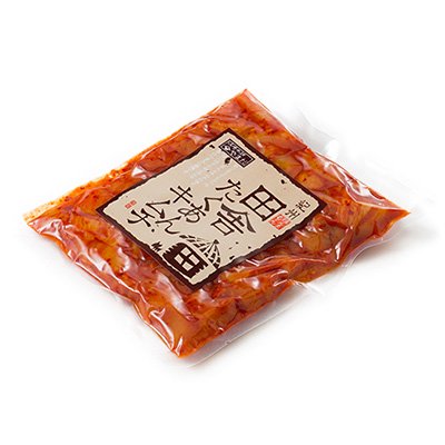 「ほんまもんたくあん」を食べやすい一口サイズにカットし、ピリ辛の美味しいキムチ味に仕上げました。焼きそばやチャーハンの仕上げに、軽くたくあんキムチを炒め合わせていただくと、簡単にキムチ味バージョンができあがります。もちろんそのままカリポリとお召し上がりいただけ、ビールにも最適です!