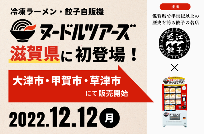 昭和33年創業の業務用麺類製造業を行う株式会社丸山製麺(本社:東京都大田区、代表取締役:丸山和浩)は、有名ラーメンの“本物のスープ”と丸山製麺の“麺”を使ったコラボ商品が24時間いつでも購入できる冷凍ラーメン自販機『ヌードルツアーズ』( https://noodle-tours.com/ )を、本日2022年12月12日(月)より、大津市、甲賀市および草津市に設置し、販売開始します。なお、いずれも近江餃子 無人店舗近くや無人店舗内に設置されます。