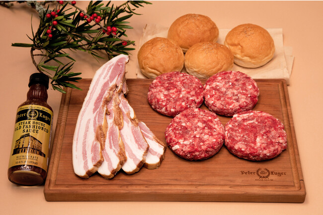 ピーター・ルーガーの東京店では、テイクアウト予約サイトにて、熟成肉やバーガーパテ、オリジナルステーキソースなど人気商品を集めた3種類の福袋を、お年玉価格でご用意します。自慢の熟成肉を人数や用途、予算に合わせてお選びいただける超お得な福袋です。ブティックでは通常、販売をしていない熟成ラムチョップやベーコン、バーガーパテに合わせて製造したバンズも一緒にご用意しました。