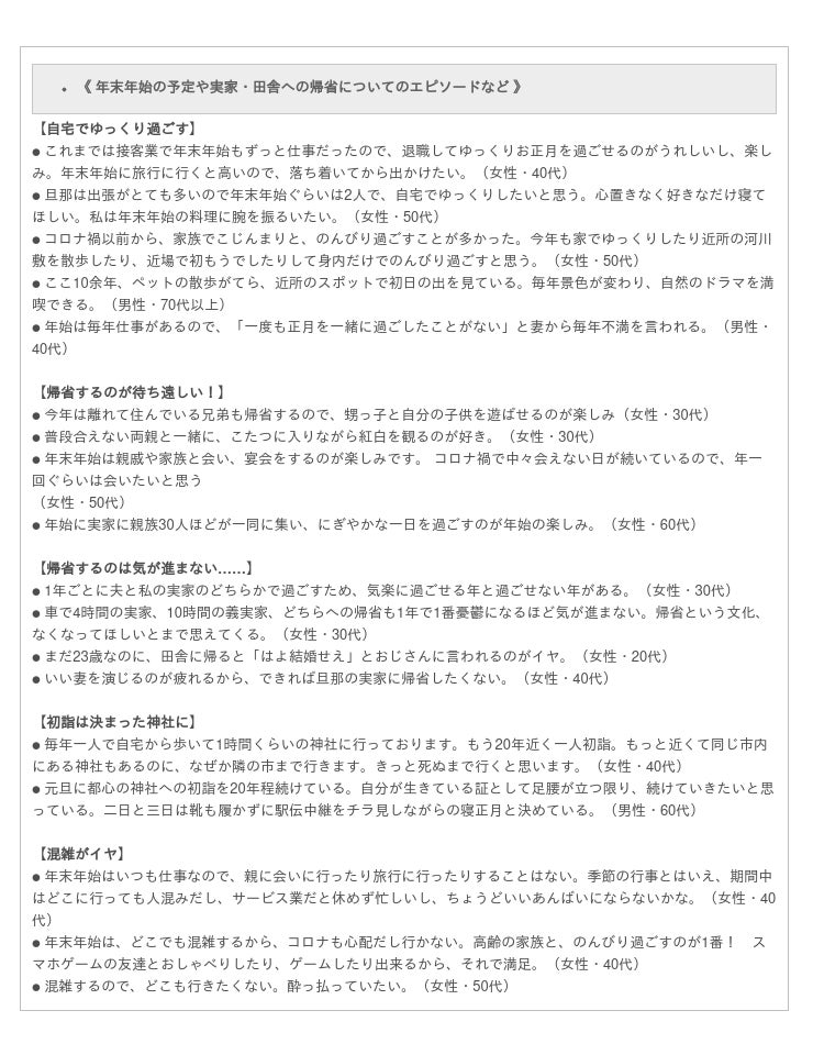 年末年始の予定や過去のエピソードを自由回答で聞いたところ、「年末年始が楽しみ」「いつもと変わらない」「気が重い」と、人によってさまざまでした。家族、親戚や友人と久々に会うことを楽しみにしている人がいる一方で、「両親が高齢だから」「全国あちこちから帰省してきた人が集まるのはちょっと……」と、今年も自粛ムードの人も。また、「夫の実家に帰省するのがストレス」という女性の声が複数見られました。