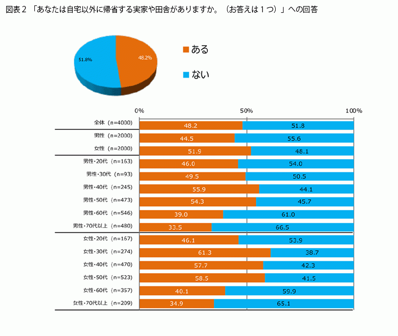 そもそも「実家」が存在しなければ帰省することもできません。自宅以外に帰省する実家や田舎があるかを聞くと(図表2)、「ある」人が48.2%、「ない」人が「51.8」%でした。男女ともに「70代以上」が最も「ない」割合が高く、次いで「60代」、「20代」の順でした。
