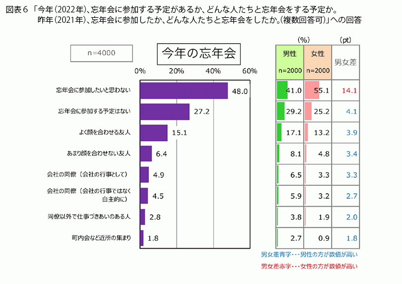 続けて、忘年会について掘り下げて聞きました。「あなたは今年(2022年)、忘年会に参加する予定があったり、参加したいと思っていたりしますか。参加する予定がある方やしたいと思っている方は、どんな人たちと忘年会をする予定なのか、したいと思っているのかを教えてください」という質問では(図表6・上)、「忘年会に参加したいと思わない」という人が48.0%と約半数でした。特に女性は55.1%の人が「参加したいと思わない」と回答しています。