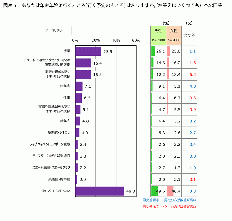 次に、年末年始に出かけるところを聞いたところ、「初詣」(25.5%)、「デパート、ショッピングセンターなどの商業施設、商店街」(15.4%)、「実家や親戚の家に年末・年始の挨拶」(15.3%)といった項目が上位に並びました。