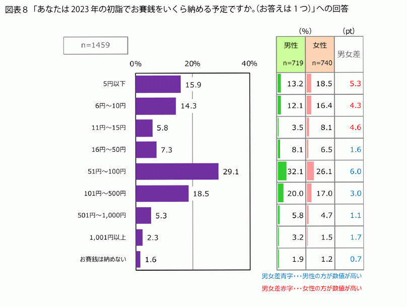 初詣でお賽銭をいくら納めるかを聞くと(図表8)、「お賽銭は納めない」と回答した人は1.6%で、ほとんどの人がお賽銭を納めるようです。