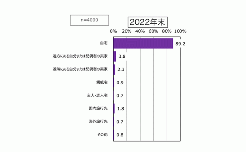 2020年末にも同様の質問をしています。その際は、「自宅」と回答した人は82.3%でした。2年前と比べると、「自宅」で過ごす人が5ポイント以上上昇しています。そのかわり、「遠方にある自分または配偶者の実家」と回答した人が7.0%から3.8%に、「近隣にある自分または配偶者の実家」が、5.3%から2.3%に減少しています。