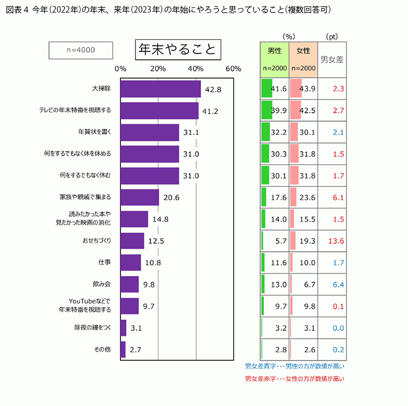 年末年始にやろうと思っていることを聞くと(図表4)、年末のトップ5は「大掃除」(42.8%)、「テレビの年末特番を視聴する」(41.2%)、「年賀状を書く」(31.1%)、「何をするでもなく体を休める」(31.0%)、「何をするでもなく休む」(31.0%)という結果でした。また年始のトップ5は「テレビの年始特番を視聴する」(36.7%)、「初詣」(36.5%)、「何をするでもなく休む」(32.3%)、「何をするでもなく体を休める」(30.2%)、「家族や親戚で集まる」(23.9%)という順になっています。