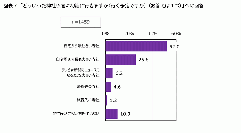 「年始に初詣に行く予定」と回答した人を対象に、初詣に行く場所について聞くと(図表7)、半数を超える人が「自宅から最も近い寺社」(52.0%)、次いで、「自宅周辺で最も大きい寺社」(25.8%)でした。初詣のために遠出する人はあまりいないようです。