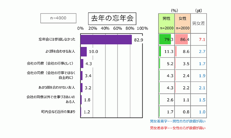 去年の忘年会について、参加したか、どんな人たちと忘年会をしたかを聞くと(図表6・下)、「忘年会には参加しなかった」という人が82.9%でした。