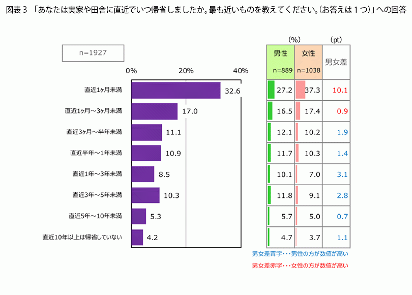 帰省する実家や田舎がある人に、直近でいつ帰省したかを聞くと(図表3)、男女ともに最も割合が高いのが「直近1ヶ月未満」(32.6)%でした。「直近1ヶ月~3ヶ月未満」(17.0%)、「直近3ヶ月~半年未満」(11.1%)、「直近半年~1年未満」(10.9%)と、直近の帰省から1年未満の人は合計で71.7%です。