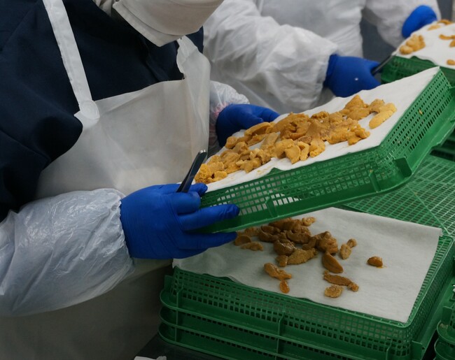 世界のうに漁獲量No.1のチリ。チリの冷たい海で育った良質な天然の“うに”は甘みがたっぷり。スシローでは、バイヤーが現地に出向き、生産者の方々にご協力をいただき、“うに”の旨みや風味を損なわないまま日本に運べるように、加工方法や物流までこだわって仕入を行っています。