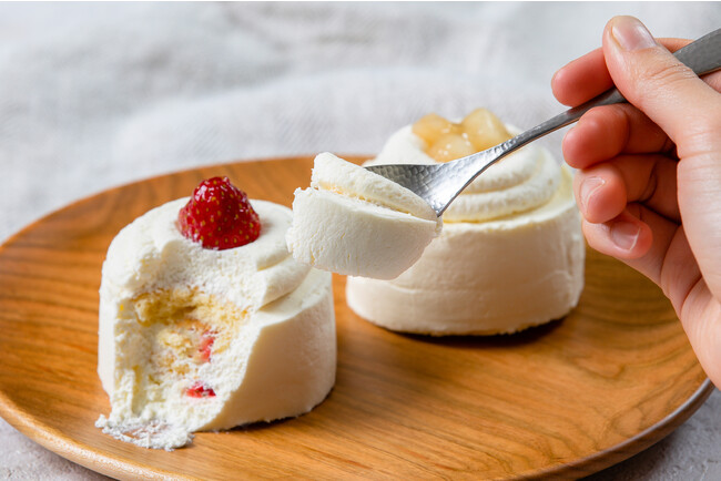 一般的に、冷凍ケーキでは生クリームの保型のために添加物やゼラチンを入れたり、糖分量を増やすことが通例になっています。しかし、今回使用した材料は「生乳と砂糖のみ」。冷却技術によって生クリームが分離せず、自然でなめらかな口溶けに。甘みは最低限に控え、植物性油脂や添加物はもちろん、香料なども一切使っていません。