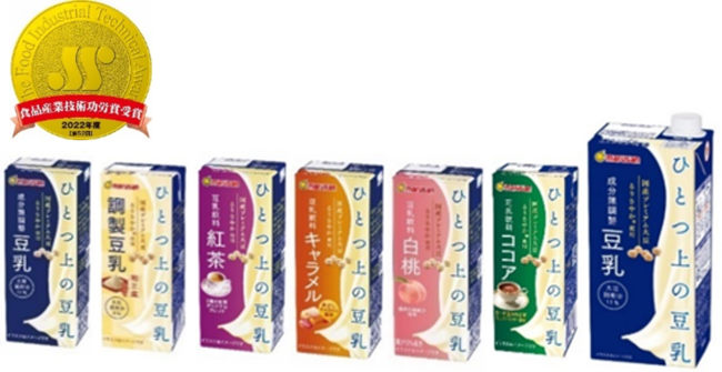 「食品産業技術功労賞」は1971年に制定され、食品産業の発展に著しく貢献した企業、または個人、団体を顕彰するものです。今回の受賞は2021年9月に実施した「ひとつ上の豆乳」シリーズのリニューアルにおいて、“本当においしい豆乳”を追求するために、既存に加え新品種の国産プレミアム大豆を新たに使用したことや、バイオマスプラスチックを25%以上配合した環境にやさしいストローを採用するなど、原材料、品質管理、製法、デザインすべてにこだわり抜いた商品づくりが評価されました。
