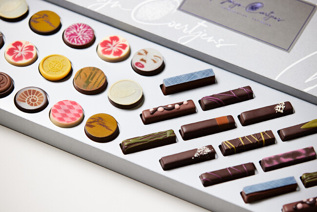 新しくなったパッケージは、ブランドカラーであるパープルに、シルバーを加えました。蓋をあけると、シルバーのトレーにエアブラシアートやスタンプを用いた個性的で華やかなショコラが際立ちます。