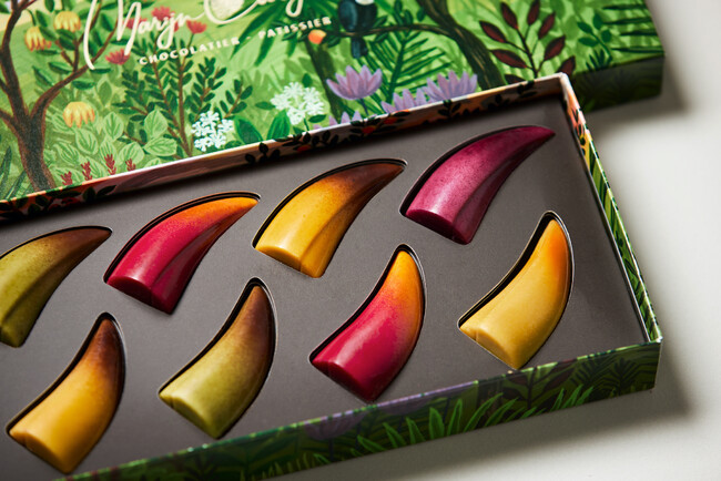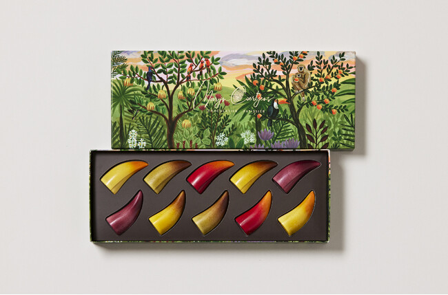 ジャングルに生息する野鳥「トゥーカンバード(日本名オオハシ)」のクチバシをモチーフにした、ジューシーでフレッシュな5種の果実の味わいを楽しむショコラ。2023年の新フレーバー "ライム&チリペッパー"は、爽やかなライムの酸味と香りに、ほのかに感じるチリの刺激が特徴。10個入り限定でお楽しみいただけるフレーバーです。