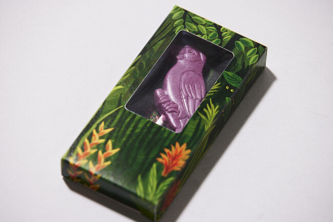 毎冬フレーバーが変わる野鳥の形の棒付きショコラ。2023はホワイトチョコレートに甘酸っぱいカシスを練り込み、中には口の中で楽しく弾けるパチパチキャンディーを入れました。