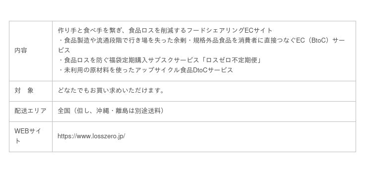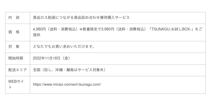 本提携は、当社が提供するフードシェアリングサービス「ロスゼロ」と、中部電力ミライズコネクトが提供する食品ロス削減につながる食品詰め合わせ優待購入サービス「TSUNAGU table」において、食品メーカーからの仕入と商品の開発を共同で実施するものです。