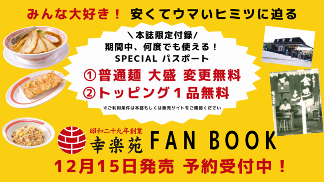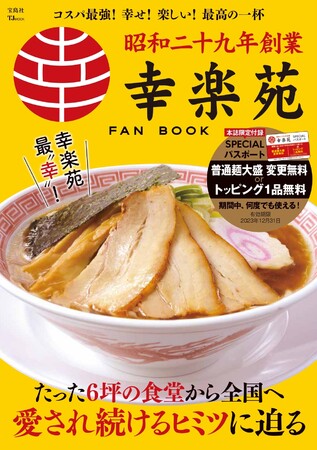 「幸楽苑」初となる公式ファンブックが完成しました。本誌限定付録は、“普通麺 大盛 変更無料”または“トッピング1品無料”のどちらか選べる特典がついたお得なSPECIALパスポートです。誌面では、福島県会津若松市で従業員3人、たった6坪で始めたお店が今や日本を代表するチェーン店になるまでの歴史や、らーめんから餃子、サイドメニューまで画像付きのグランドメニューパーフェクトガイドを掲載。他にも、伝統を支え進化させていく達人たち(社員)への取材、知ると幸楽苑に行くのがもっと楽しくなるトリビアの紹介など、幸楽苑通になれる一冊です。