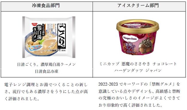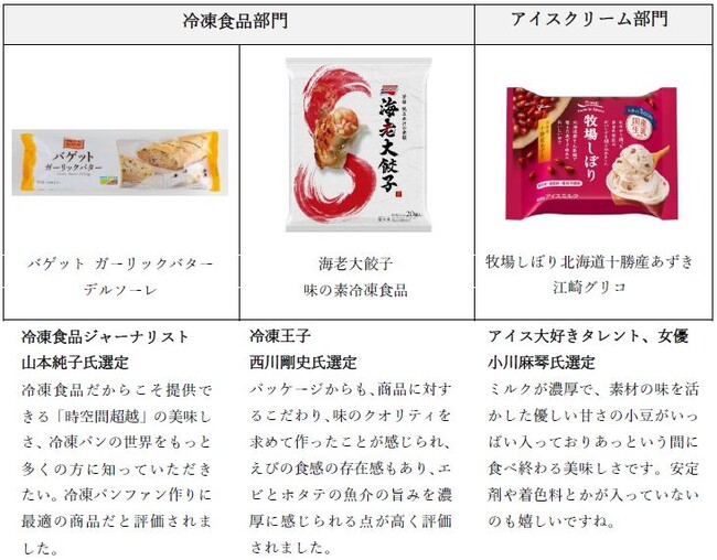 新商品の エントリー 商品 から、メディア1 社様が選定。 デザイン、ヒット期待度、PR動画での表現力、コンセプトを軸に採点しました。本賞は新たなヒット商品の発掘や、フローズン・アワードの目的でもある、新規顧客取り込みのために、新商品にスポットを当てています。