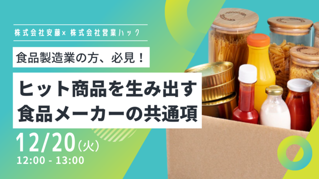 株式会社営業ハック(本社:東京都港区)と株式会社安藤(本社:群馬県高崎市)が共催ウェビナーを行います。日時は2022年12月20日(火)12:00~13:00、参加費は無料です。需要予測が難しいほどお客様のニーズが多様化する中でファンでい続けていただくためには既存の商品サービスの満足度を維持し続けるのと同時に、新しい商品やサービス=新しい価値を世の中に提供し続けることが求められています。本ウェビナーでは、創業から100年余りにわたり多くの食品メーカーの商品開発を支えてきた株式会社安藤の代表取締役社長安藤俊哉氏と、多くの営業組織の新規開拓を支援してきた営業ハック代表の笹田裕嗣が登壇し、別々の視点・立場からヒット商品を生み出すための必要な考え方やエッセンスをご紹介いたします。視聴登録はこちら:https://lp.hiroshi-sasada.com/hitmaker