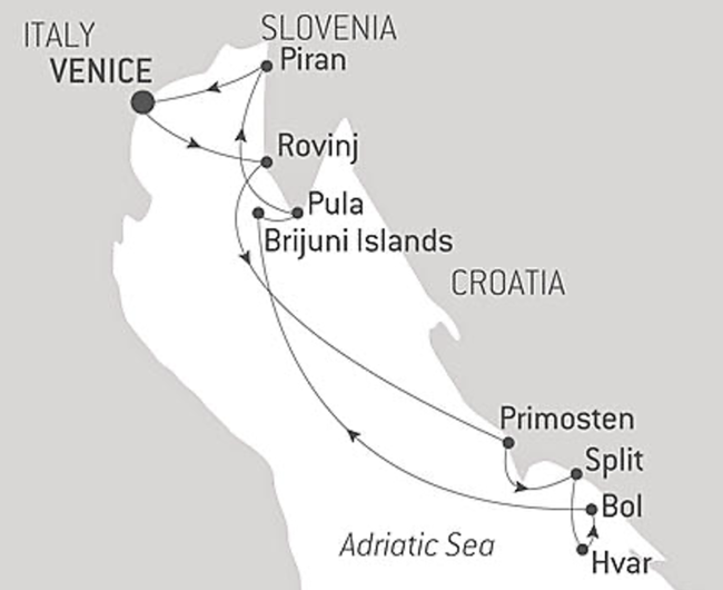 海岸線に沿って何百もの魅惑的な島々が点在し、類まれな遺産を誇るアドリア海は、驚きと魅惑に満ちています。ル・ブーゲンビル号はドージェの街を出航し、イストリア半島の宝石と呼ばれるロヴィニに向かいます。その後、ダルマチア地方北部の魅力的な漁村プリモシュテン、ユネスコの世界遺産に登録されているスプリットの街と歴史地区、フヴァル、ブラチ島、ブリユニ群島、プーラへ向かいます。さらに、城壁に囲まれたスロベニアの都市ピランに寄港した後、ヴェネツィアへ戻ります。
