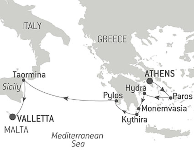 アテネを出発したル・ブーゲンビル号は、ギリシャと壮大なマルタ の海岸を結ぶ旅にお客様をお連れします。キクラデス諸島のパ ロス島、車のないイドラ島、そしてモネンバシア半島に残るヴェネ チアやビザンチン様式の建築物を訪れます。ピロス港に寄港し てネストール宮殿を見学した後、再び海に出て、エトナ山麓のタ オルミーナに向かいます。最終目的地は、マルタ騎士団の本拠 地であるバレッタです。