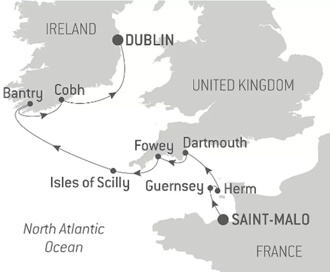 ブルターニュの海岸からアイルランドの海岸まで、英仏海峡とケルト海の交差する大西洋での航海は、青々とした草原、岩崖、色とりどりの小さな村の間にある、謎めいた美しさの風景の中心へとあなたを導きます。サン・マロを出発した船は北西に向かい、自然豊かなチャンネル諸島に到着します。その後、ダート川の河口の魅力的な小さな町ダートマスに向かい、コーンウォールの伝説的な断崖に沿って、イーニッド・ブライトンの名作からそのまま飛び出したような風景が広がる不思議な小さな島々、シリー諸島に向かいます。バントリーとコーヴに寄港した後、アイルランドの活気と魅力にあふれた首都ダブリンでクルーズが終了します。