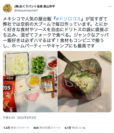 主に、メキシコの路上で屋台販売されるドリロコス。市販のトルティーヤチップス「ドリトス」に、直接肉や野菜などの具材を混ぜ入れて食べるドリロコスは、メキシコの国民食として親しまれています。高山がこのドリロコスを自宅で調理したところ、あまりの美味しさに感動。お裾分けにとレシピをTwitterに投稿すると、瞬く間にツイートは拡散され、ドリロコスは局所的にブームとなりました。